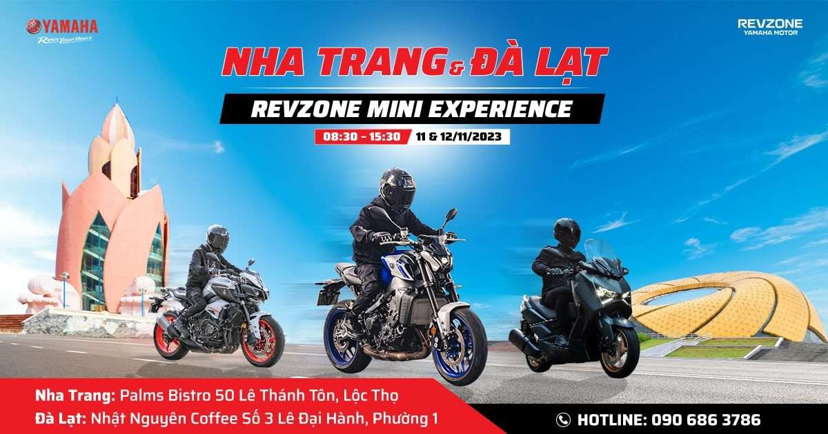 Chương trình Revzone Mini Experience: Trải nghiệm lái thử xe moto Yamaha và dịch vụ lưu động tại hai thành phố tuyệt đẹp Nha Trang và Đà Lạt sẽ diễn ra trong hai ngày 11/11 & 12/11/2023. Đây là cơ hội trải nghiệm các dòng xe phân khối lớn nổi tiếng của Yamaha không thể bỏ qua dành cho các fan đam mê thương hiệu xe Nhật Bản tại Nha Trang, Đà Lạt và các tỉnh thành lân cận.
