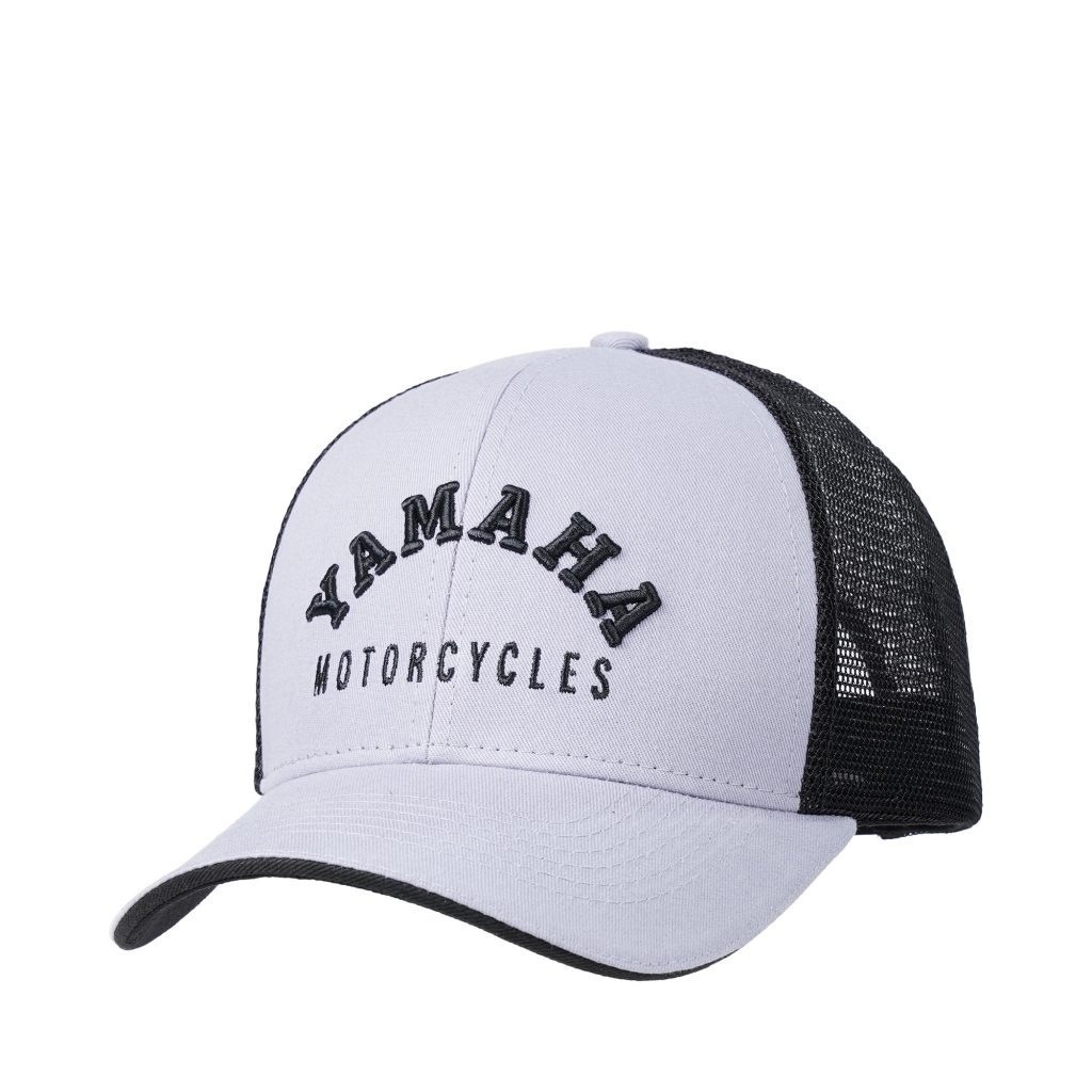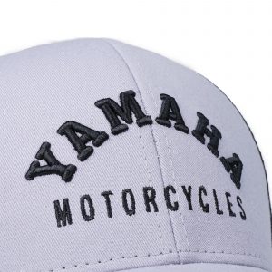- Nón lưỡi trai thêu logo thương hiệu Yamaha Motorcycles màu đen nổi bật trên nền nón xám, tạo điểm nhấn ngay trung tâm