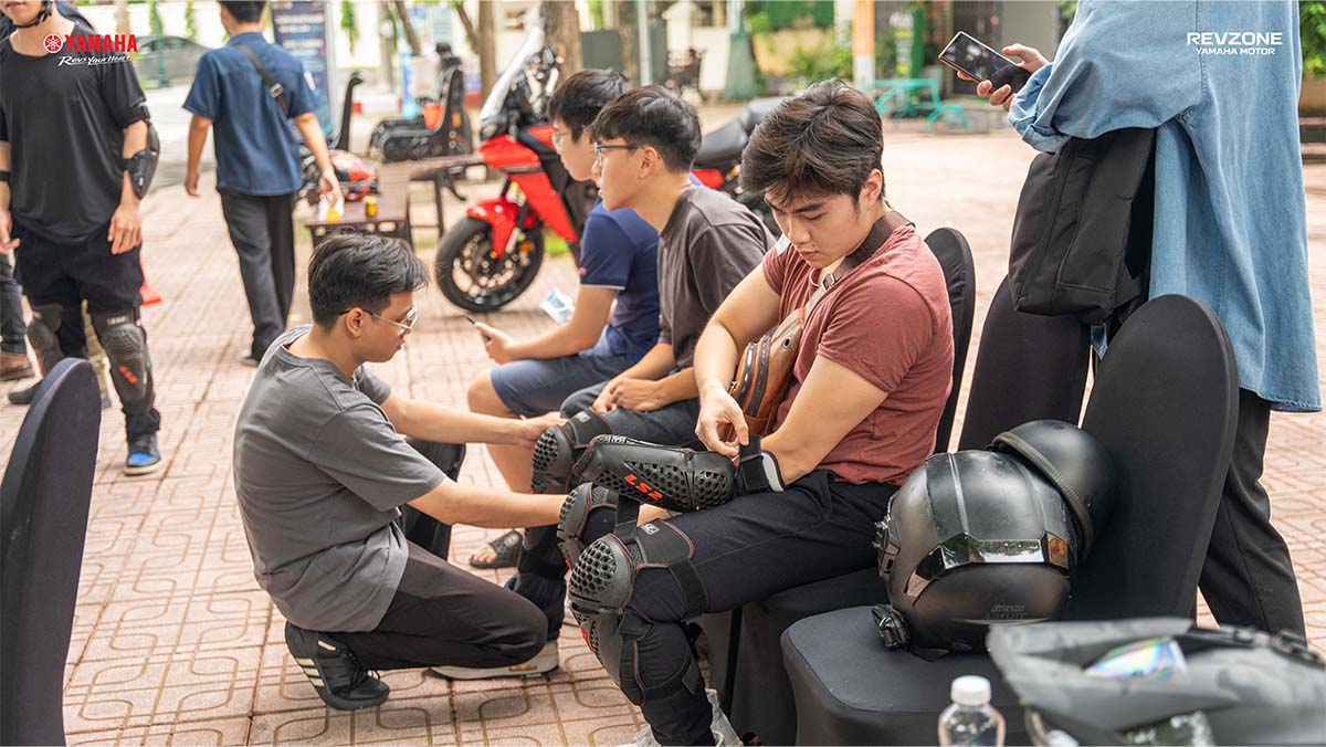 Đội ngũ nhân viên tại Revzone Yamaha Motor cũng rất chú trọng đến việc bảo đảm an toàn cho những người tham gia sự kiện khi cung cấp và hỗ trợ trang bị giáp gối, giáp trỏ, găng tay và mũ bảo hiểm 3/4 cho từng người lái.