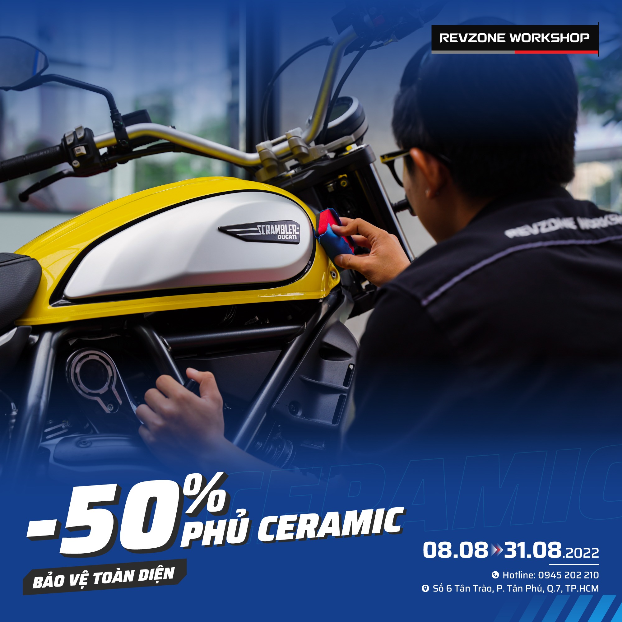 Phủ Ceramic sẽ giúp bảo vệ lớp sơn khỏi tia UV và chống oxy hóa, giúp lớp sơn xe luôn sáng bóng và giữ được nét đẹp hoàn mỹ nhất với độ bền lớp phủ có thể lên đến 10 năm. Riêng dịch vụ phủ Ceramic tại Revzone có thời gian bảo hành lên đến 6 tháng, đảm bảo mang lại sự hài lòng cho các anh em.