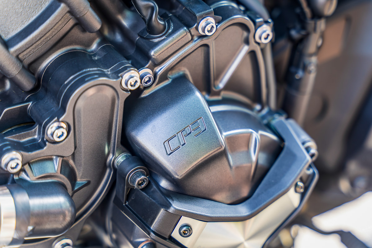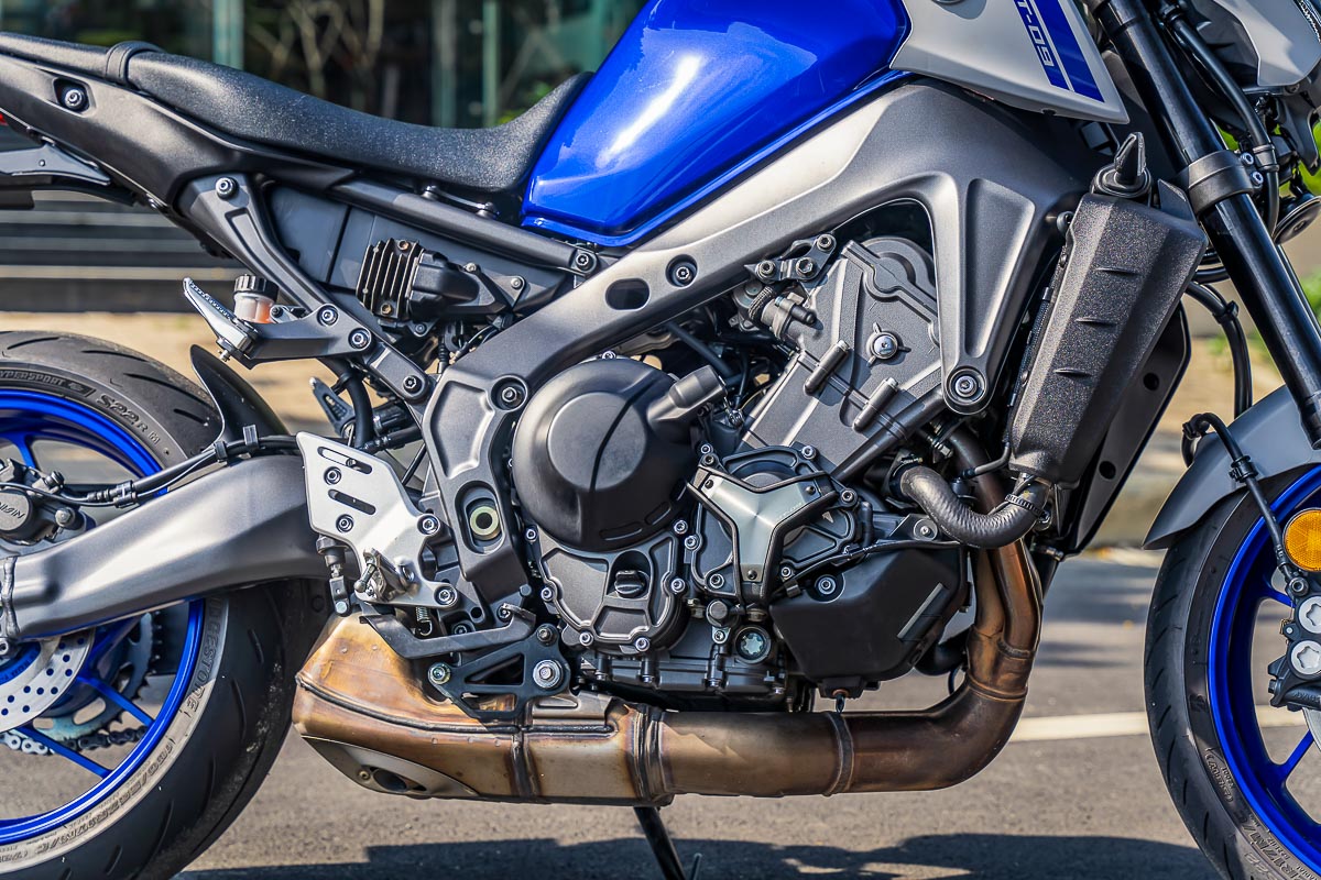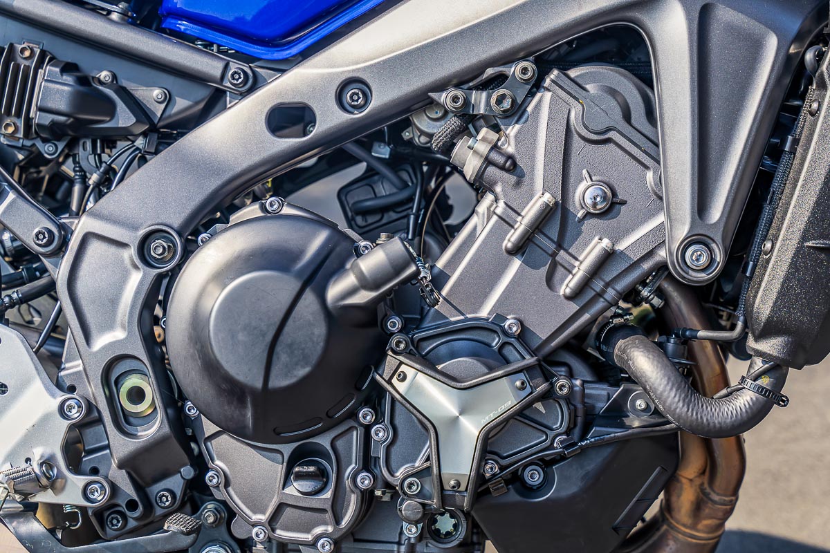 Động cơ trên MT-09 thế hệ mới đã được tăng dung tích từ 847cc của thế hệ trước lên 890cc thông qua việc kéo dài hành trình piston thêm 3 mm. Việc này khiến tay dên trên MT-09 mới có chiều dài ngắn hơn 1.5mm so với phiên bản cũ, góp phần làm giảm trọng lượng xy lanh và trọng lượng quán tính cho trục khuỷu, giúp xe tăng tốc tốt hơn. Nhờ vậy, MT-09 thế hệ mới cho ra công suất và mô men xoắn cực đại cải thiện lần lượt 3% và 6% so với phiên bản cũ, đạt công suất tối đa 119 mã lực tại vòng tua 10.000 vòng/phút và mô men xoắn cực đại đạt 93 Nm tại 7.000 vòng/phút. Bộ ly hợp chống trượt 6 cấp trên MT-09 cũng được cải tiến giữa các vòng lò xo và góc đặt trục cam, với tỉ số truyền thay đổi nhẹ giữa số 1 và 2 nhằm phù hợp với động cơ mới.
