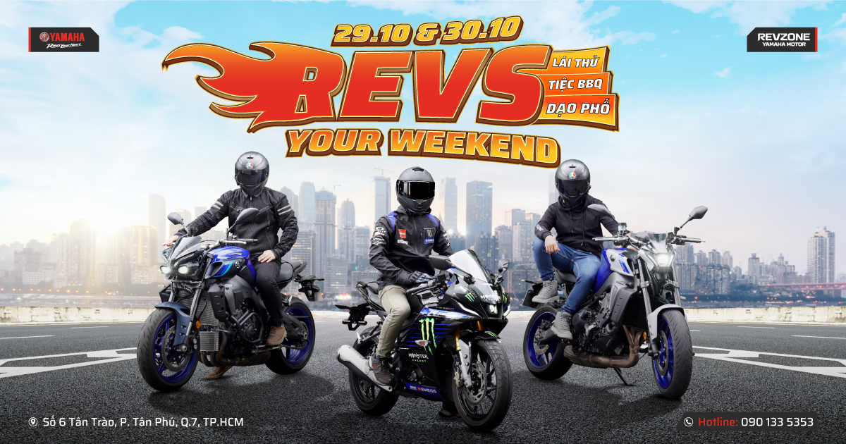 Với mong muốn mang sự trải nghiệm đến tận tay khách hàng, Revzone Yamaha Motor thân mời quý khách hàng cùng tham dự sự kiện Revs Your Weekend để trải nghiệm sức mạnh và cảm giác lái của các mẫu xe mô-tô Yamaha, kết hợp với tiệc BBQ và dạo phố đêm Sài Gòn vào cuối tuần này.
