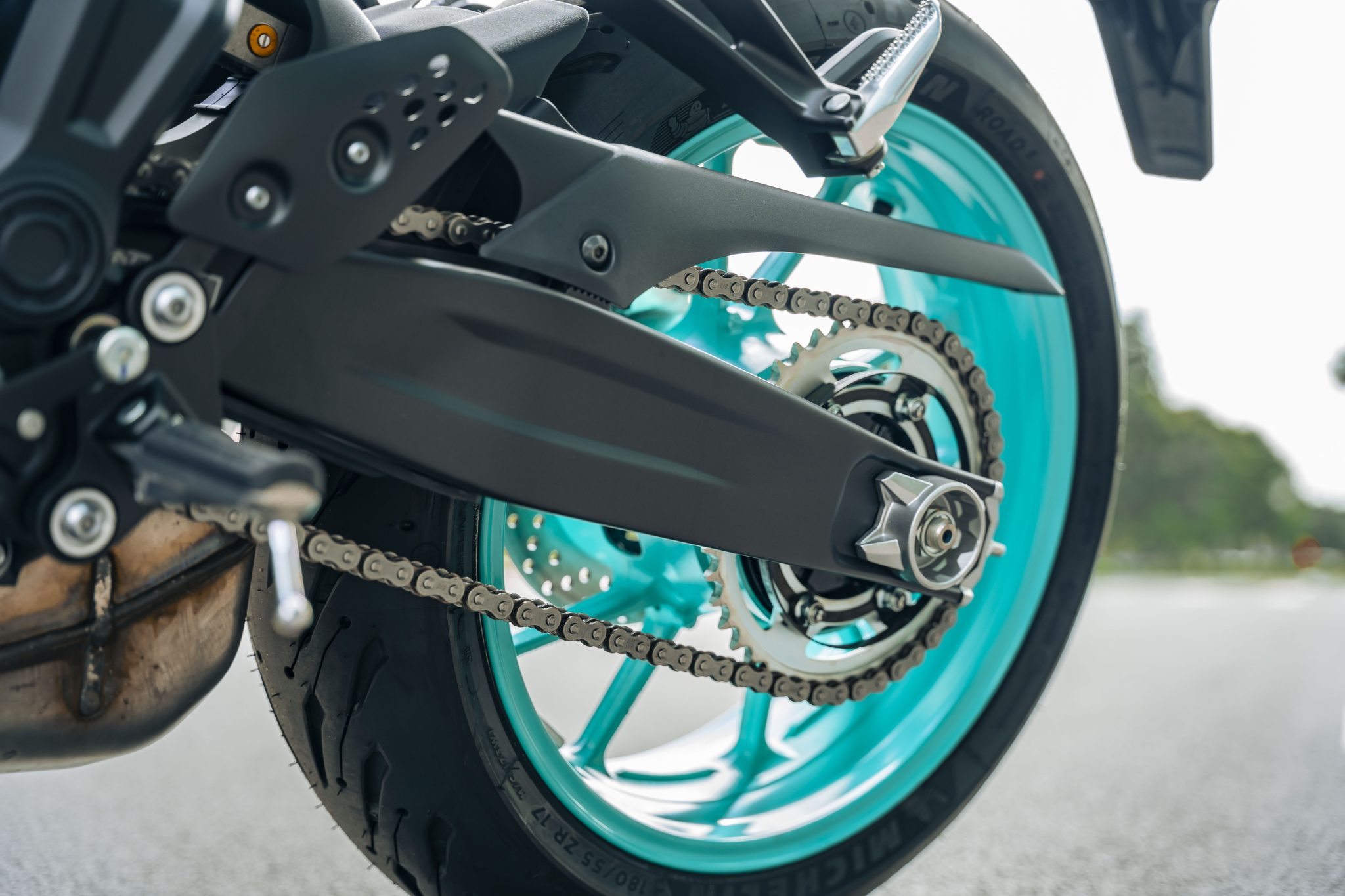 Yamaha MT-07 còn được trang bị vành đúc hợp kim 10 chấu với đường kính 17 inch, tiếp tục ghi điểm về mặt thẩm mỹ khi có cùng tông màu với phối màu xe. Bộ lốp Michelin Road 5 nổi tiếng với đường kính của lốp sau lên đến 180mm, giúp tăng độ ổn định, khả năng xử lý và độ bám đường trên cả đường khô và điều kiện đường trơn trượt.