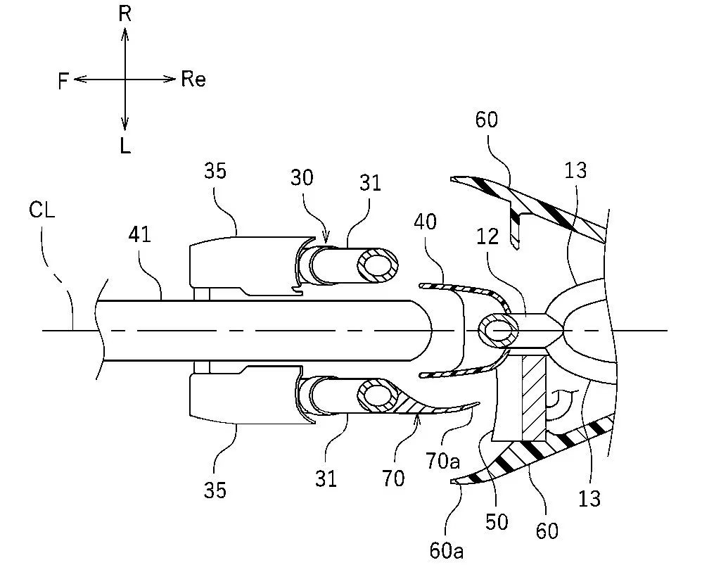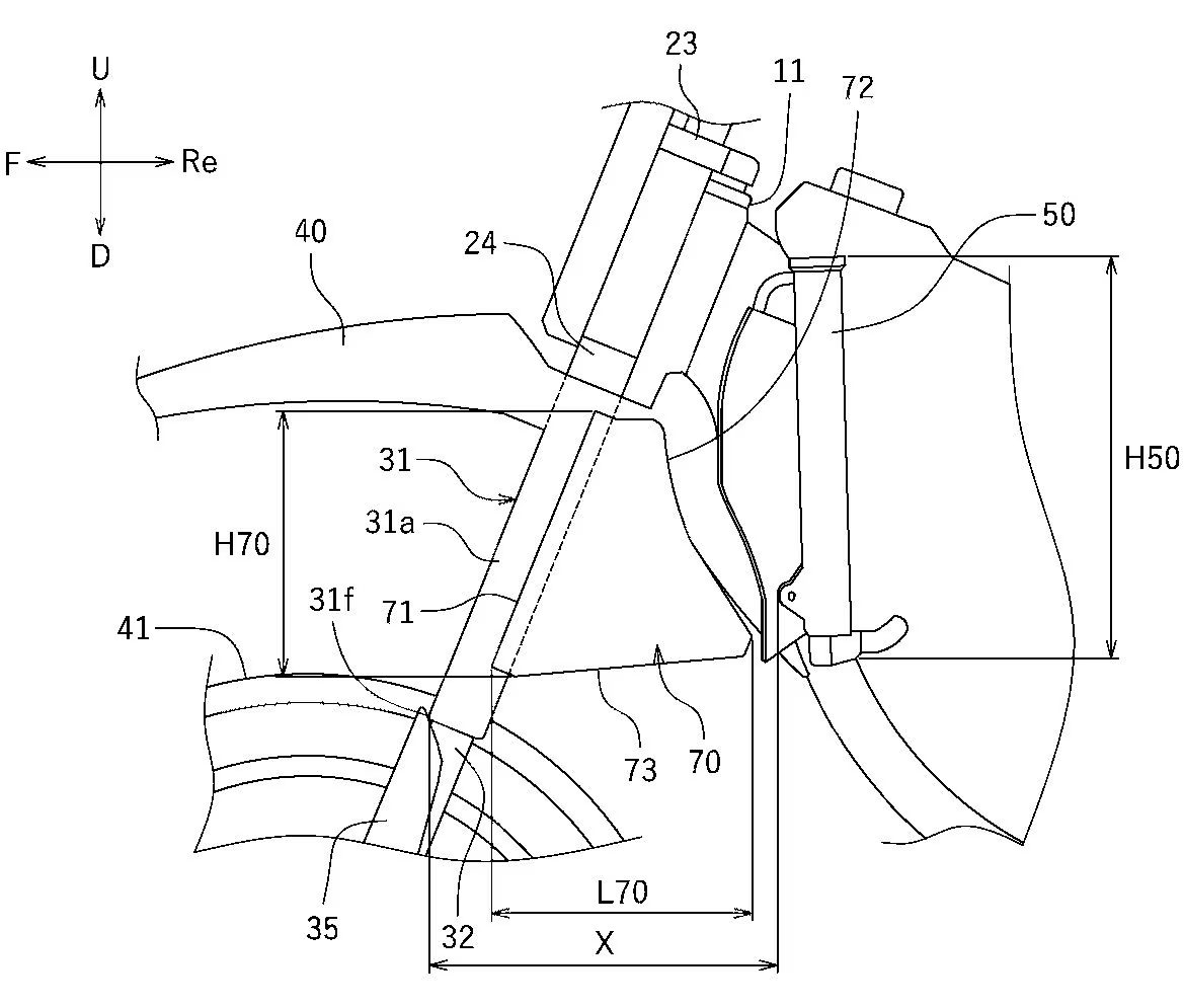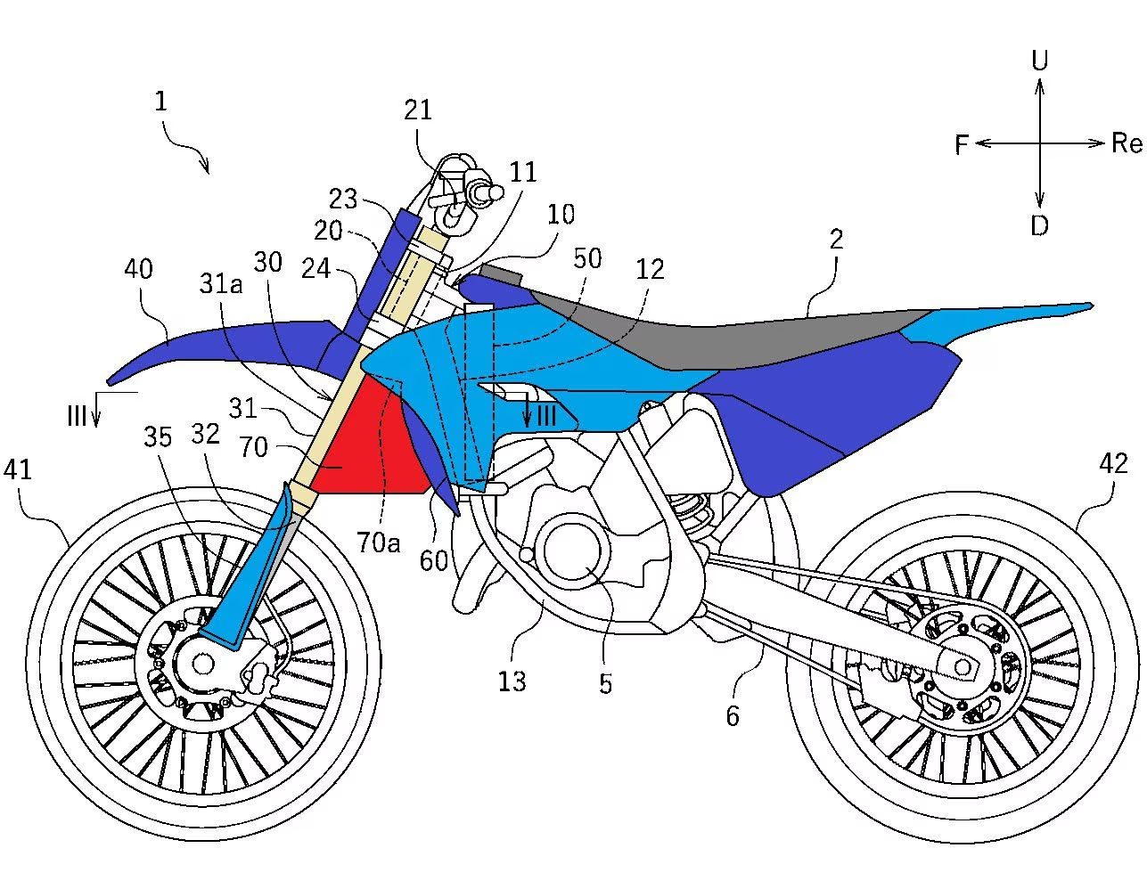 Bằng sáng chế mới nhất của Yamaha đã giải quyết vấn đề này bằng cách kéo dài thiết kế của phần nhựa ốp chân phuộc. Phần nhựa này có kích thước lớn hơn bình thường, nằm theo hướng đầu xe và được vuốt nhọn về phần đuôi để điều hướng luồng khí về vị trí cánh quạt trong két làm mát. Nhờ sáng kiến này, két làm mát có thể được thiết kế gần nhau hơn, làm giảm kích thước tổng thể xe nhưng không làm mất khả năng tản nhiệt của xe.
