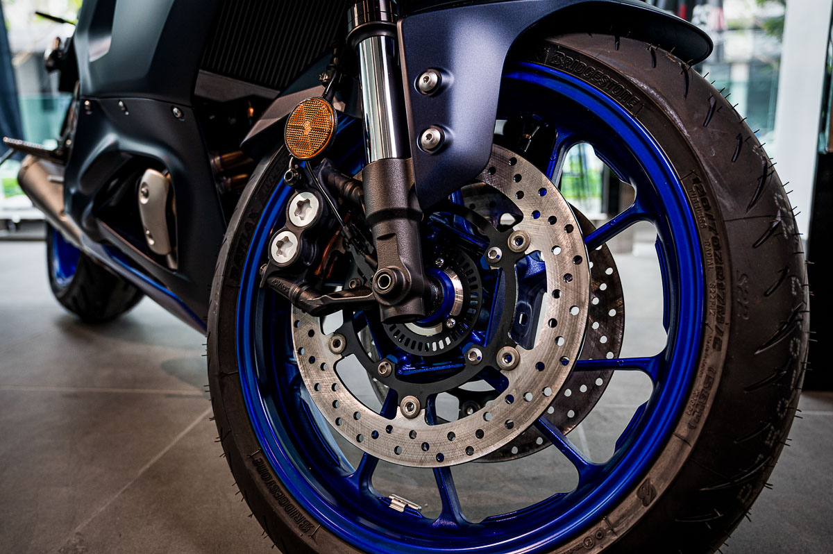 Xe được trang bị bộ mâm đúc 10 chấu trọng lượng nhẹ kích thước 17 inch, đi kèm là cặp lốp kích cỡ 120/70 phía trước và 180/55 phía sau. Việc trang bị lốp xe tiêu chuẩn Bridgestone Battlax S22 vốn nổi tiếng về hiệu suất và độ bám đường cho phép R7 có thể vận hành vô cùng linh hoạt và chắc chắn, cả trong điều kiện đường đua hay khi trời mưa.