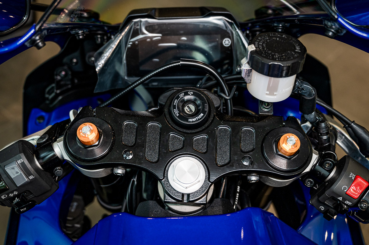 Được nâng từ “đàn anh” MT-07, R7 được trang bị với cặp phuộc trước hành trình ngược KYB USD đường kính lên đến 41mm, tức tương đương với các mẫu xe có dung tích lớn hơn. Người lái có thể dễ dàng điều chỉnh độ nén ở chân phuộc bên trái và độ đàn hồi ở chân phuộc bên phải, bên cạnh tùy chỉnh tải trọng. Phần sau KYB monoshock cũng cho phép tùy chỉnh độ đàn hồi và tải trọng, qua đó giúp thiết lập R7 tối ưu theo phong cách của người lái.