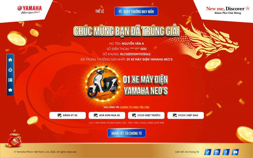 Sau đó nhấn vào ô “HOÀN TẤT TẢI CHỨNG TỪ” và màn hình sẽ hiển thị kết quả quay thưởng bao gồm thông tin trúng thưởng cùng dòng chữ “ĐÃ TẢI CHỨNG TỪ. VUI LÒNG CHỜ THÔNG TIN LIÊN HỆ TỪ YAMAHA MOTOR VIỆT NAM”, cụ thể như ảnh dưới đây: