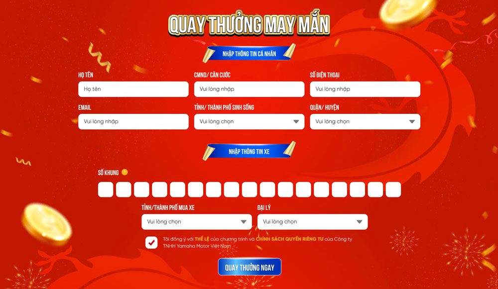 – Sau khi hoàn tất các thủ tục mua và bàn giao xe, khách hàng truy cập vào website để tham gia quay thưởng: https://quaythuongyamaha.vn, sau đó kéo xuống màn hình “QUAY THƯỞNG MAY MẮN” để nhập đầy đủ các thông tin cụ thể như bảng phía dưới, sau đó nhấn vào ô “QUAY THƯỞNG NGAY” và kết quả quay thưởng sẽ hiện ra ngay trên màn hình sau khi khách hàng thực hiện quay thưởng.