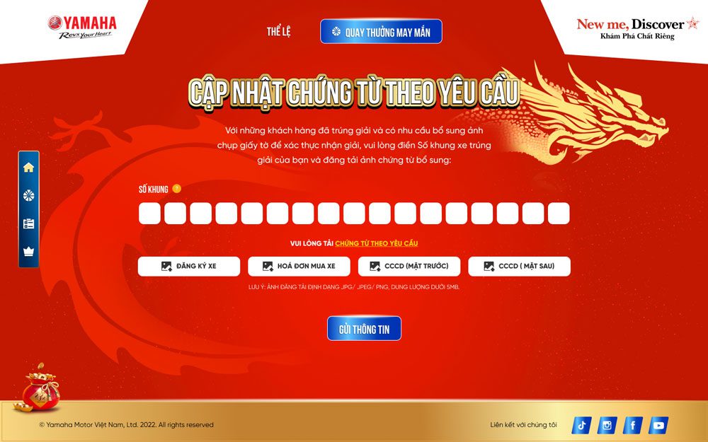 - Mỗi 01 xe Yamaha bán ra thị trường sẽ có 01 số khung xe khác nhau và khách hàng sẽ nhập số khung vào thông tin quay thưởng để hệ thống quay thưởng dựa trên số khung này.
